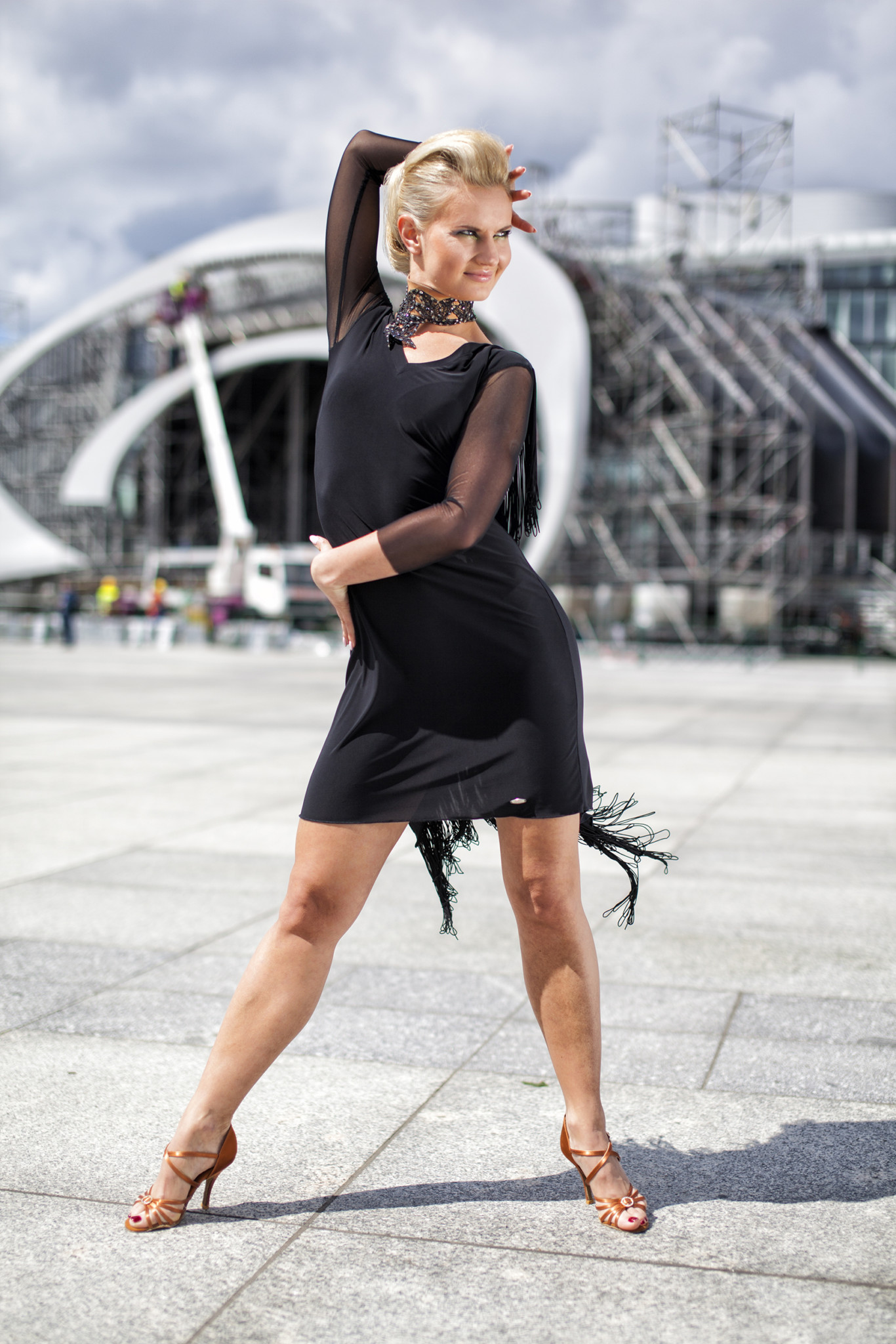 The Furlana is a classic black dress featuring dramatic fringe that moves beautifully during dance. The fringe creates spectacular visual effects with every step and turn.