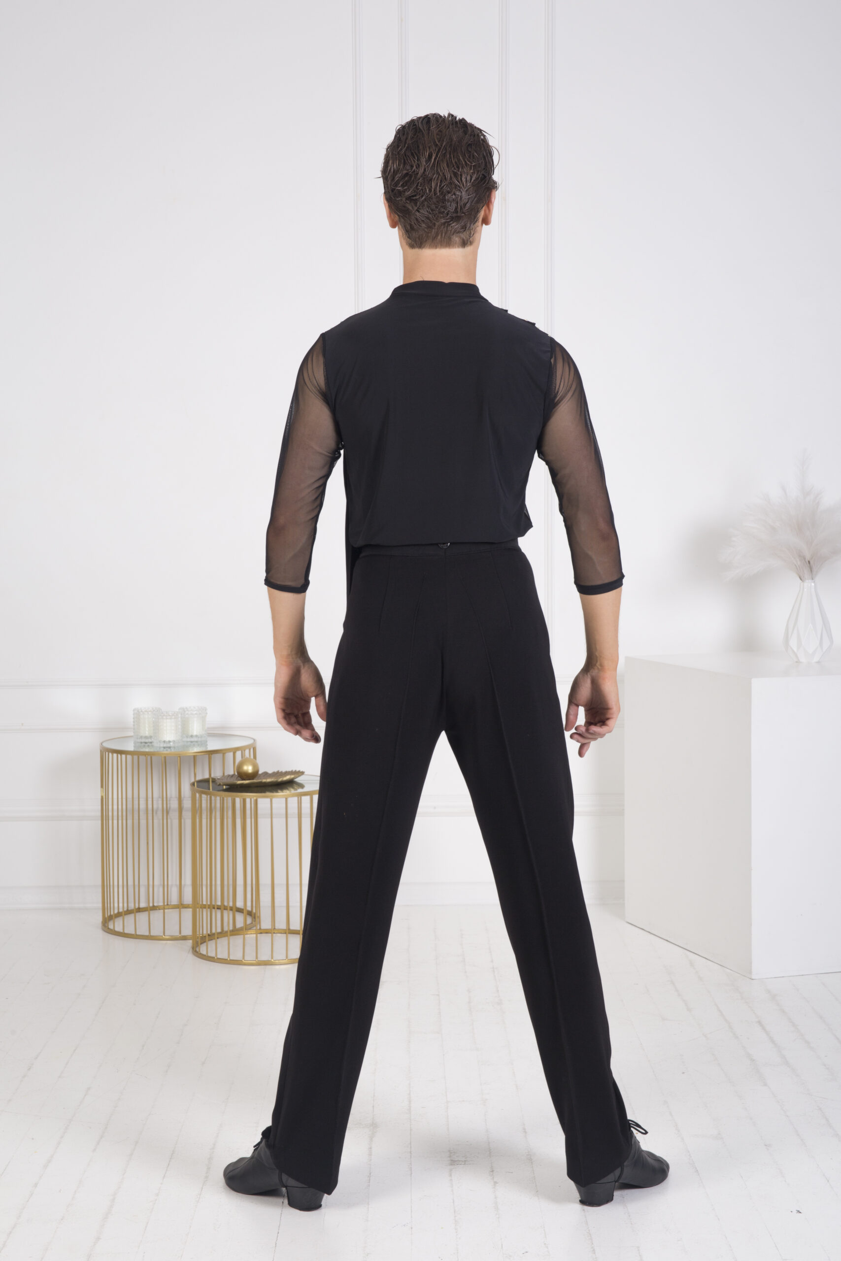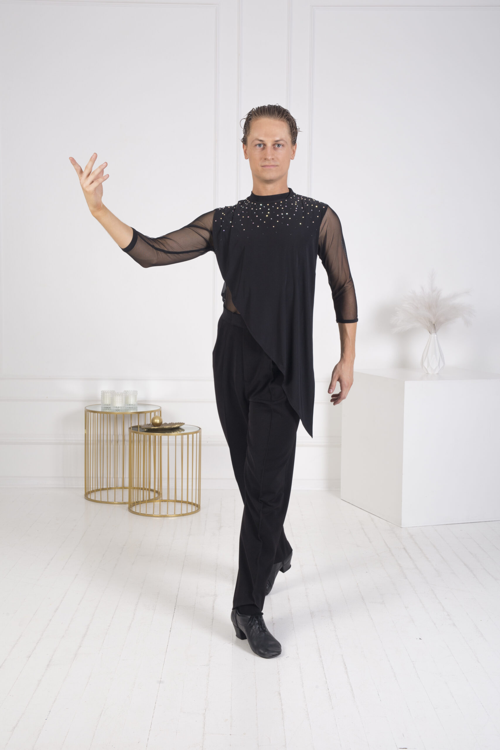 - Zdobienia: Koszula jest zdobiona cyrkoniami Crystal AB ss20 i ss16 oraz Jet Black Shine ss20 i ss16, które przyciągają wzrok i pięknie odbijają światło na parkiecie.